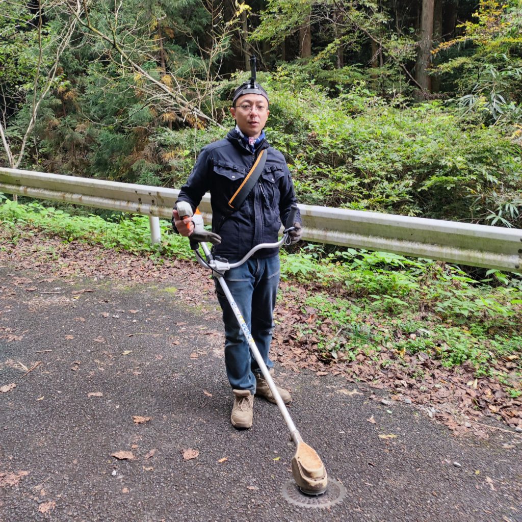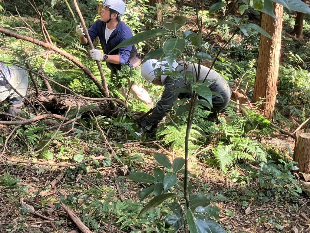 前日までの事前準備は選木、搬出経路、伐倒方向の確認、支障木の事前伐倒を行い、草刈りをしました。
