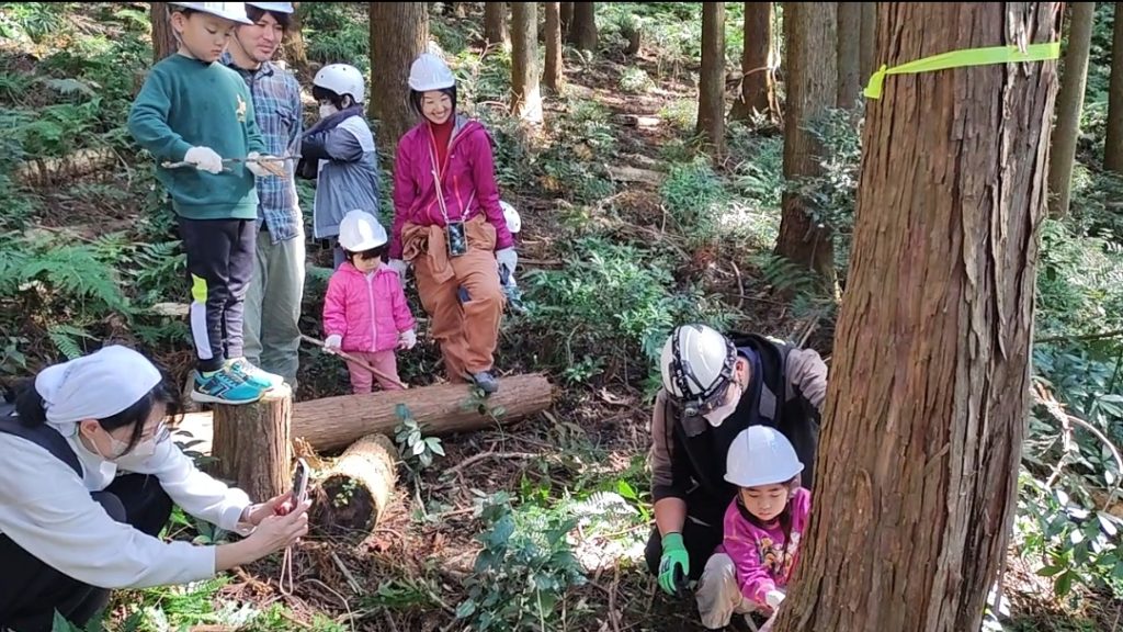 その後皆で、直径30センチ超えの桧に切り込みを入れました。小学校1年生から大人まで皆で順番に鋸を入れました。