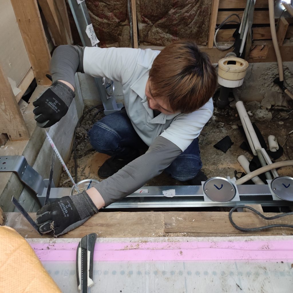 今回は専用の吊り架台を使います。工期に余裕がある場合は土間を打ちます。