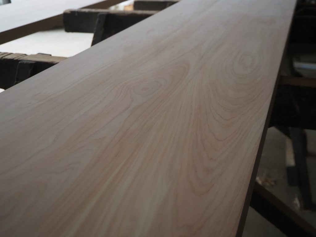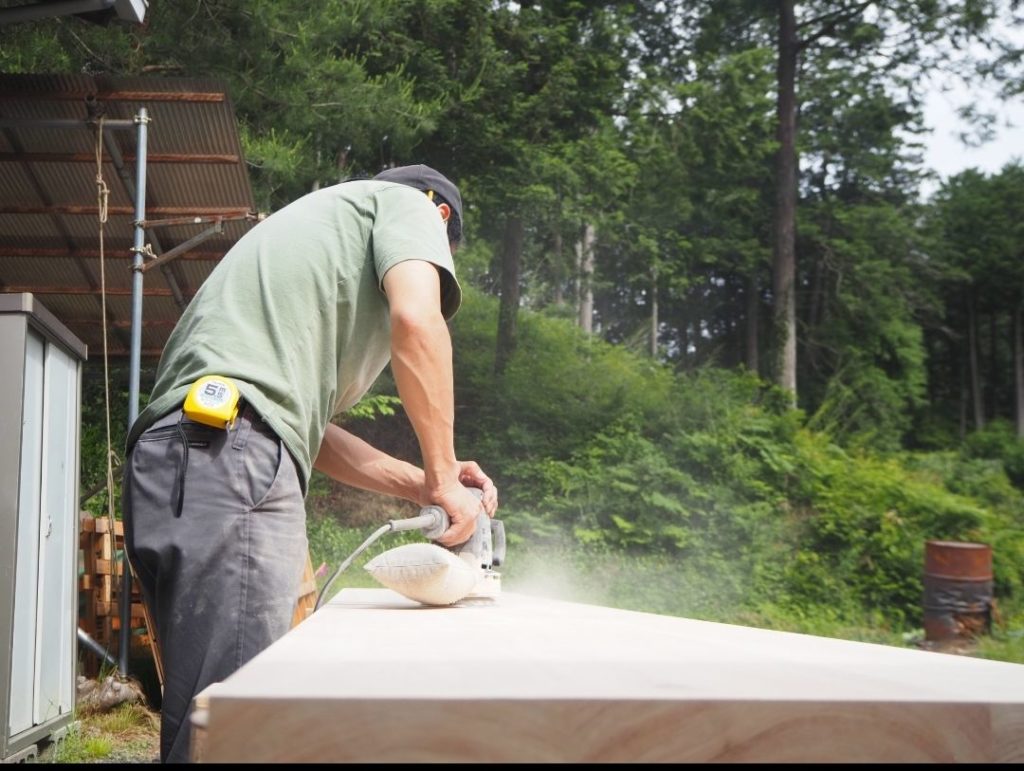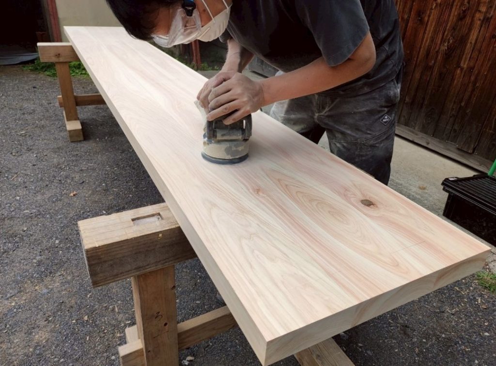 桧まみれになりながら、塗装前の下地処理を行っています。無塗装仕上げに挑戦してみたい所でしたが、飲食店天板のメンテナンスを考えてオスモ塗装としました。