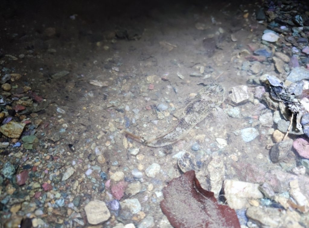 水中にはこちらも久しぶりに出会えた「カジカ」がいました。明るい時もあまり動きませんが夜は寝ているのか、さらにじっとしています。じっくり観察できました♪
