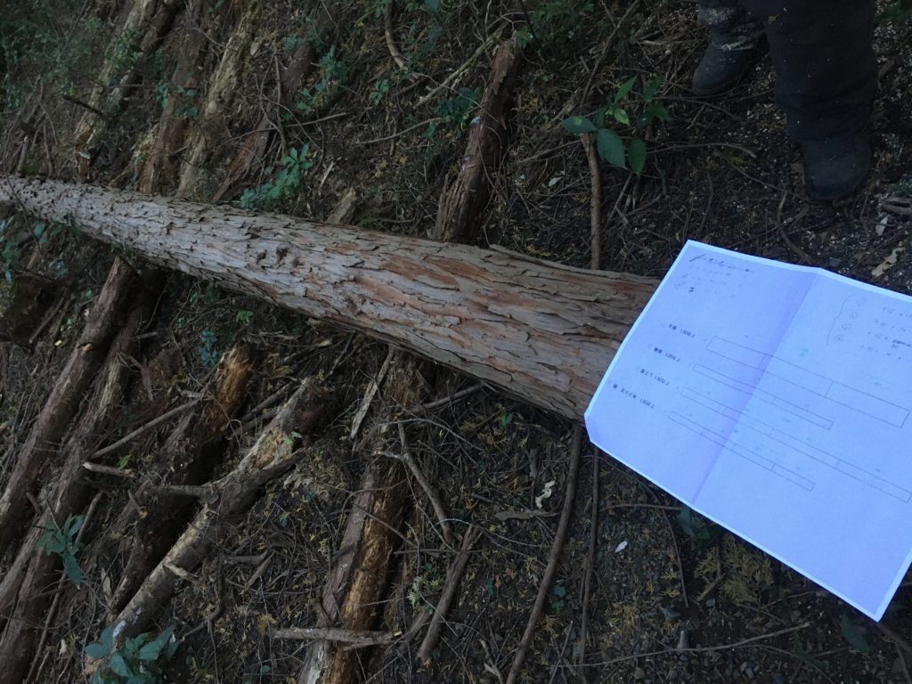 丸太を一定の長さに切る事を玉切りと言います。今回は家具用に伐採しましたので、家具の材料図面に合わせて玉切りをして頂きました!この後搬出し、製材をしていきます。