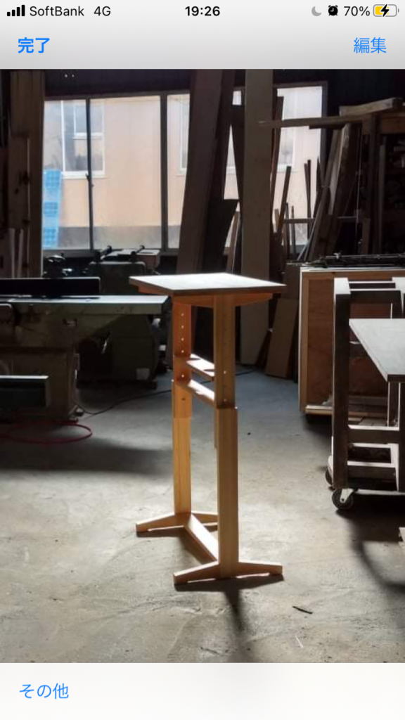 素材はときがわの山から、Oさんが伐採。私が製材をし、設計製作を篠原さんが手掛けて下さいました。名前はI desk。(篠原さん命名)関根さんのi officeで使って頂ける事、私に合った高さ調整が出来る事、横から見るとI型デザイン。