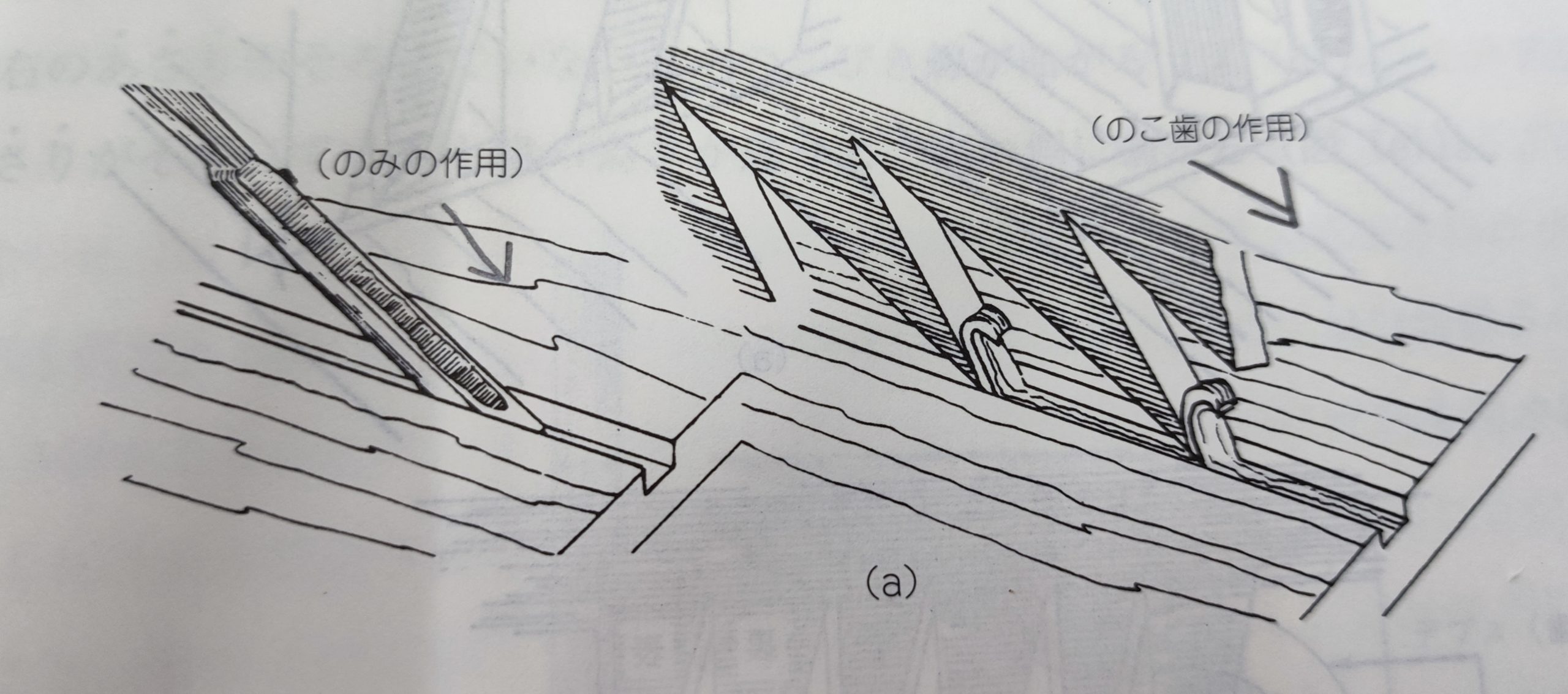 のこぎりを手前に引くときに切削作用が働き、切りクズは歯と歯の間にたまる。そこで軟材や厚板の時は刃先の大きなものを使う。また刃の角度は硬材用40〜45度。軟材は30〜35度が理想。