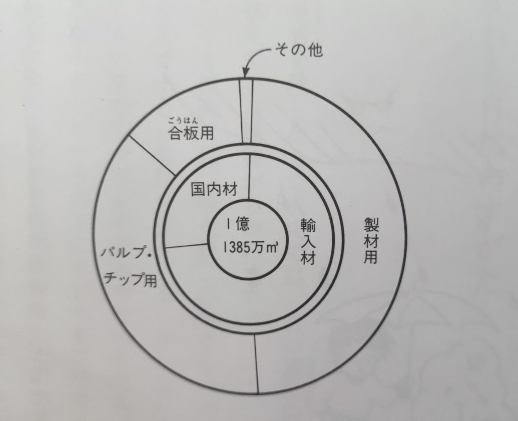 日本では身の周りに沢山のあった木材を色々な形で利用してきたので、木材使用量の多い国。現在では、鉄、コンクリート、プラスチック、石油に置き換わったように見えるけれど、毎年1億立方メートル以上の木材を消費している。1億立方メートルがどの位か調べてみると、甲子園球場に積み上げると富士山の2倍位の高さになるらしい!(ぎょえ~)これだけの木材を日本の森林からはとても切り出せないので、外国から輸入する事になる。東南アジアの国々、アメリカ、カナダ(ロシアは現在中止)などから毎年輸入される木材量は、使用料の約4分3!しかもその殆どが製材用という現状なのだ。つまり家や公共施設、商業施設に使われる木材のほぼ全てが輸入材。