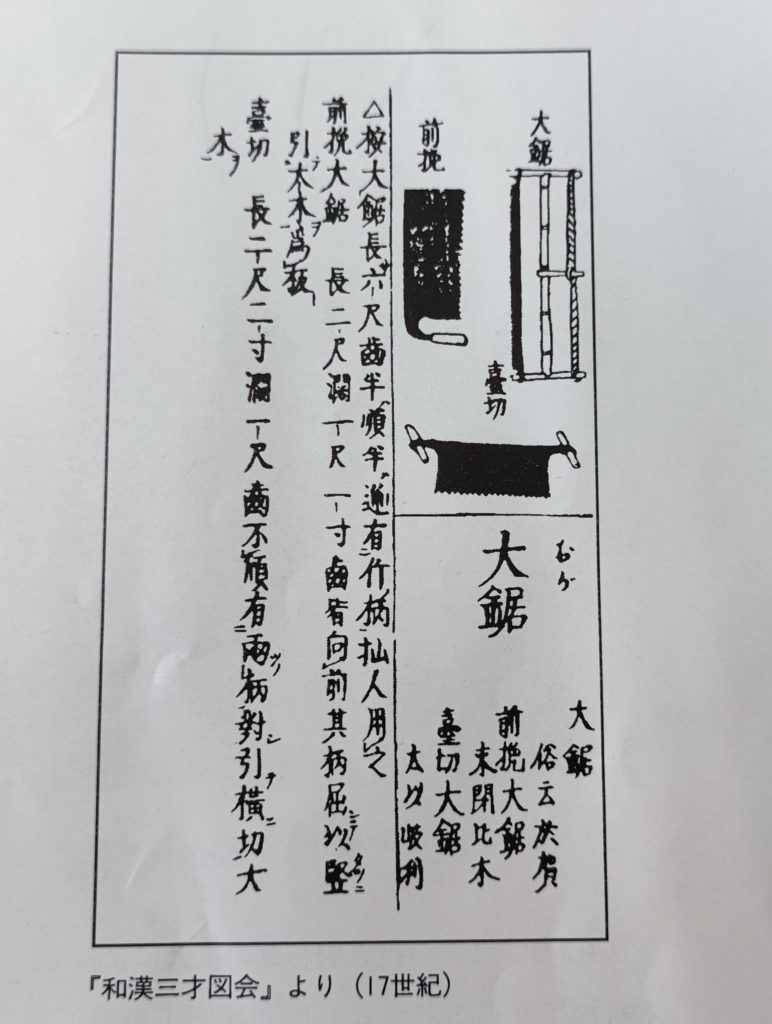 15世紀に大鋸(おが=現在のノコギリの原型)が登場して、日本に始めて縦挽き製材用のノコギリが紹介された。16世紀後半には前引が発明されて、技術が大幅に進化、そして江戸時代に職人文化が花開く。はじめの住宅建築ラッシュと言って良い時代。これを背景に江戸時代の中頃から道具百科事典なるものが作られる。
