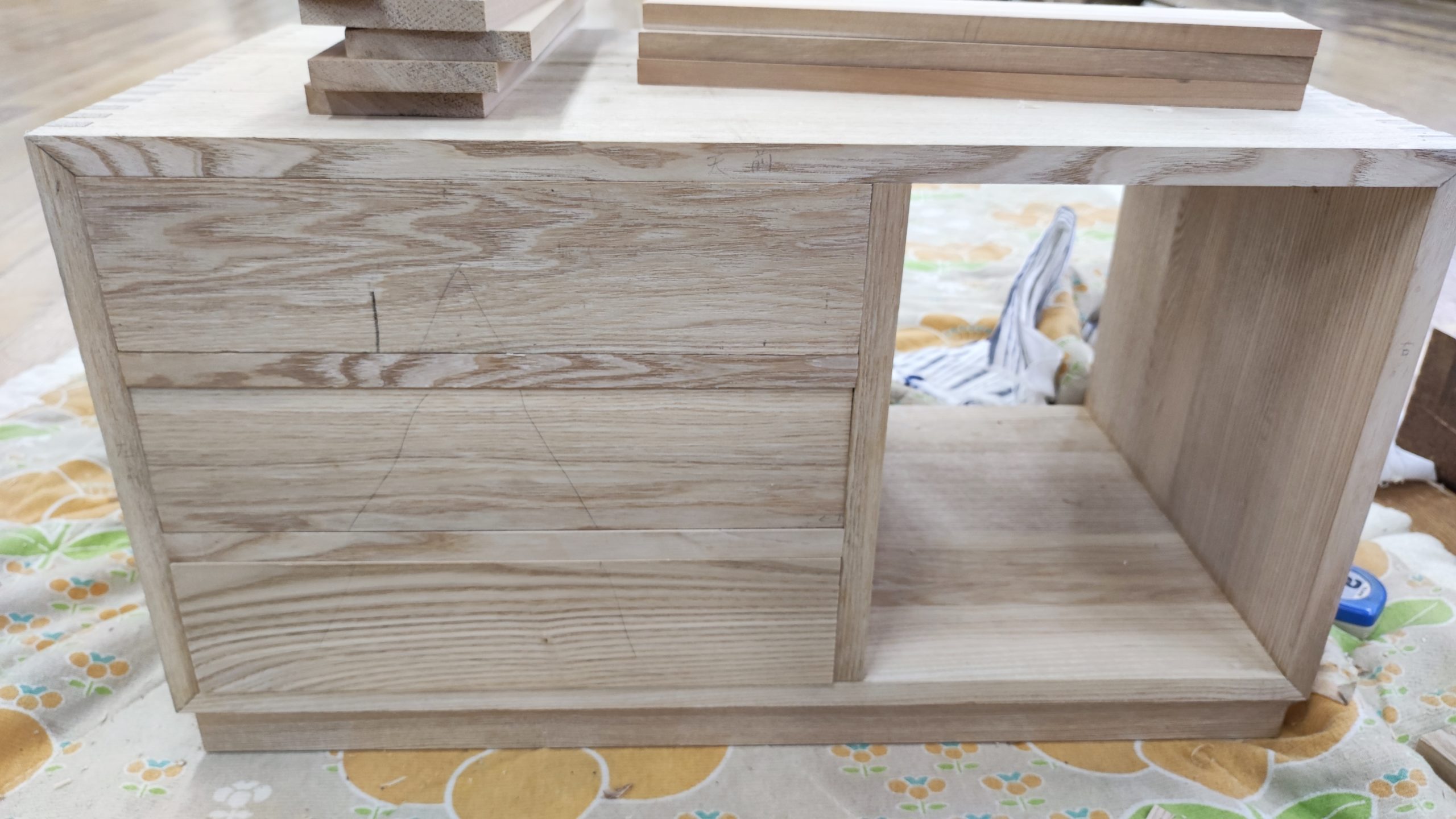 今朝も砥石を水に浸けて手道具準備のルーティン。タモ化粧棚の台輪付けが終わって、3段引出しを作っている。引出し制作のポイント。