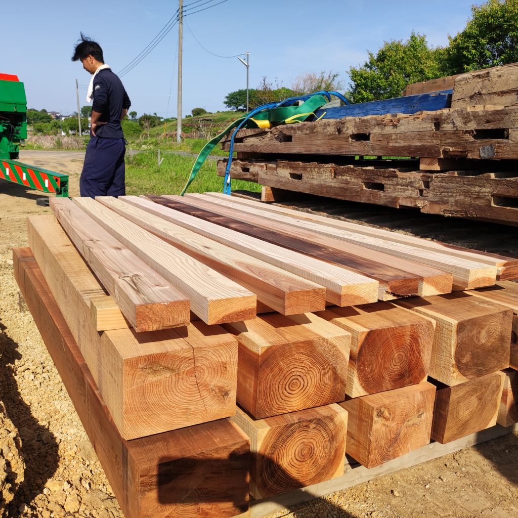 地元の山から伐採して製材した杉。 150×210の足固め材。 仲間大工の元へ納品、ありがとうございます!地元ときがわ町の木を伐採、製材して木の地産地消に取組んでいます。 こつこつ横架材、4寸角挽いてます!
