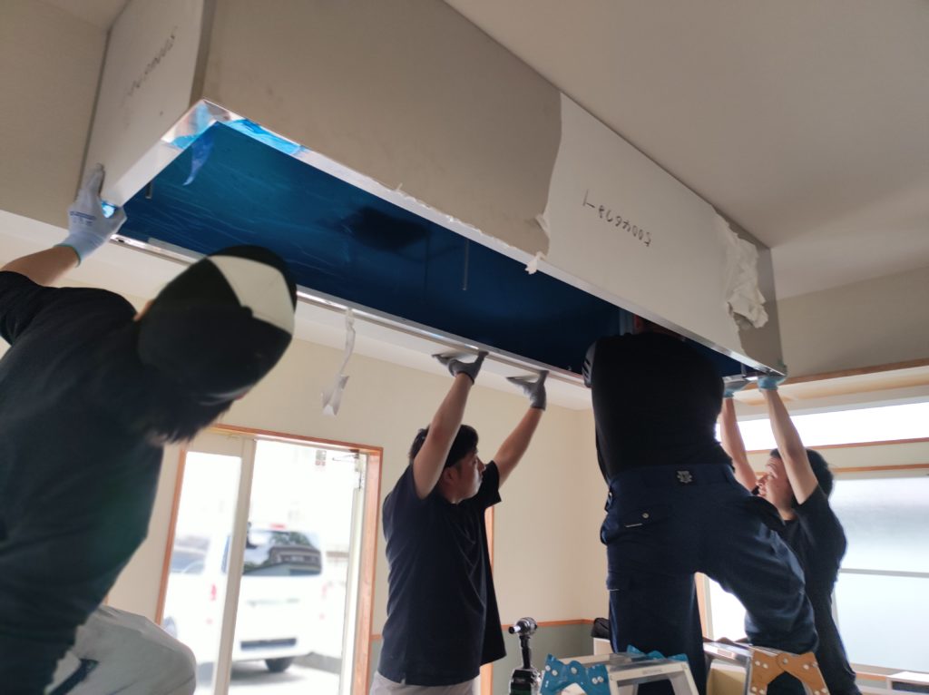 職人仲間の皆で3mの磨きフードの取付を行いました。 事前に天井補強をして天井裏から吊り下げたステンレスボルト6本。ミリ単位で墨出しをしたのでピタリとはまり、安心しました。 施主様も「私も持ちます」と軍手をして参戦して下さいました。ありがとうご...