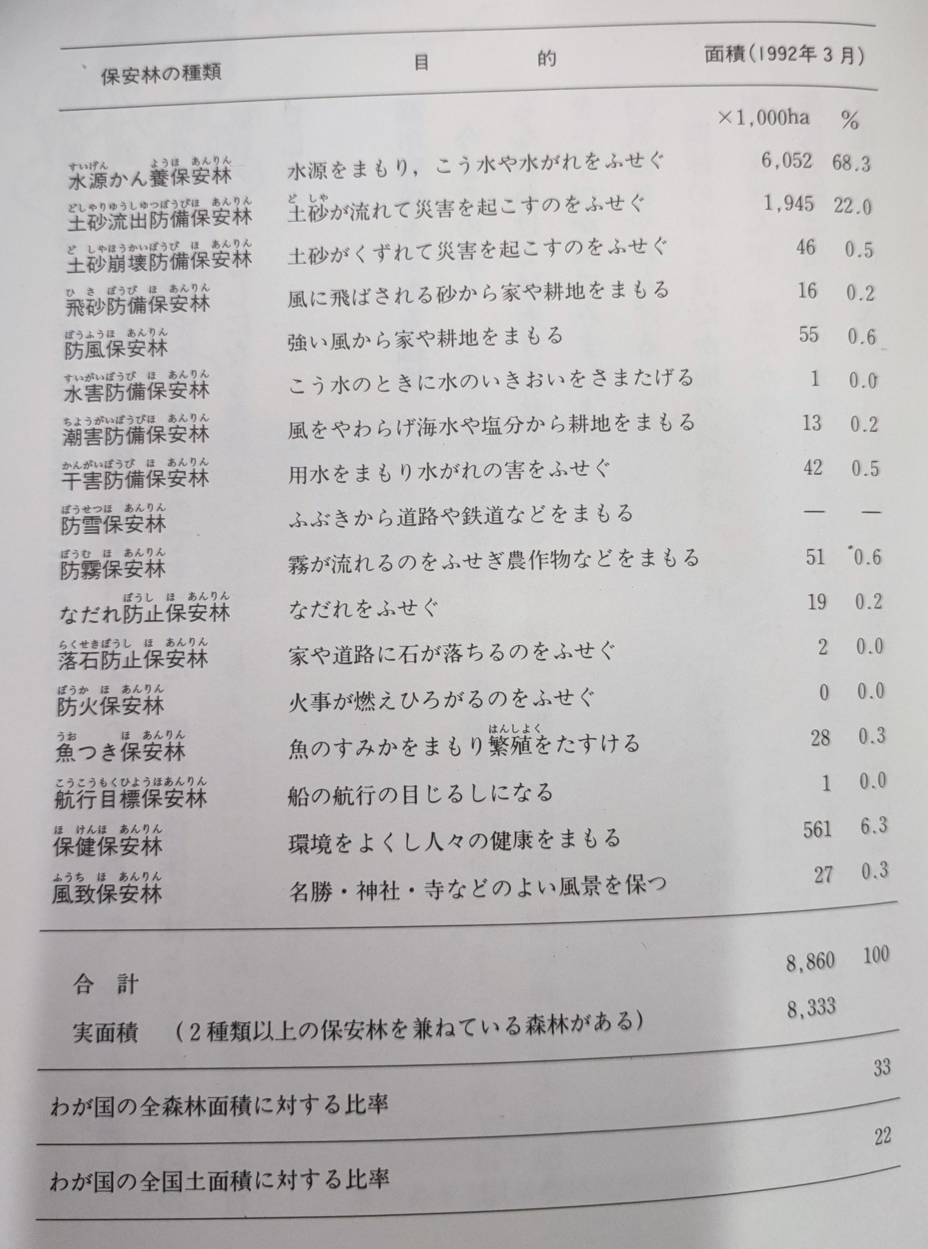 少し古い資料だが、日本の保安林は17種類で全国で830万ヘクタール程で、全森林面積の3割以上となっている。(現在は2800万ヘクタール、国土の67%)かのうちもっとも多いのは水資源を守る「水源かん養保安林」で保安林全面積の7割を占めている。日本の水が奇麗なのも、美味しい魚が獲れるのも、森林の役割が大きく影響している。