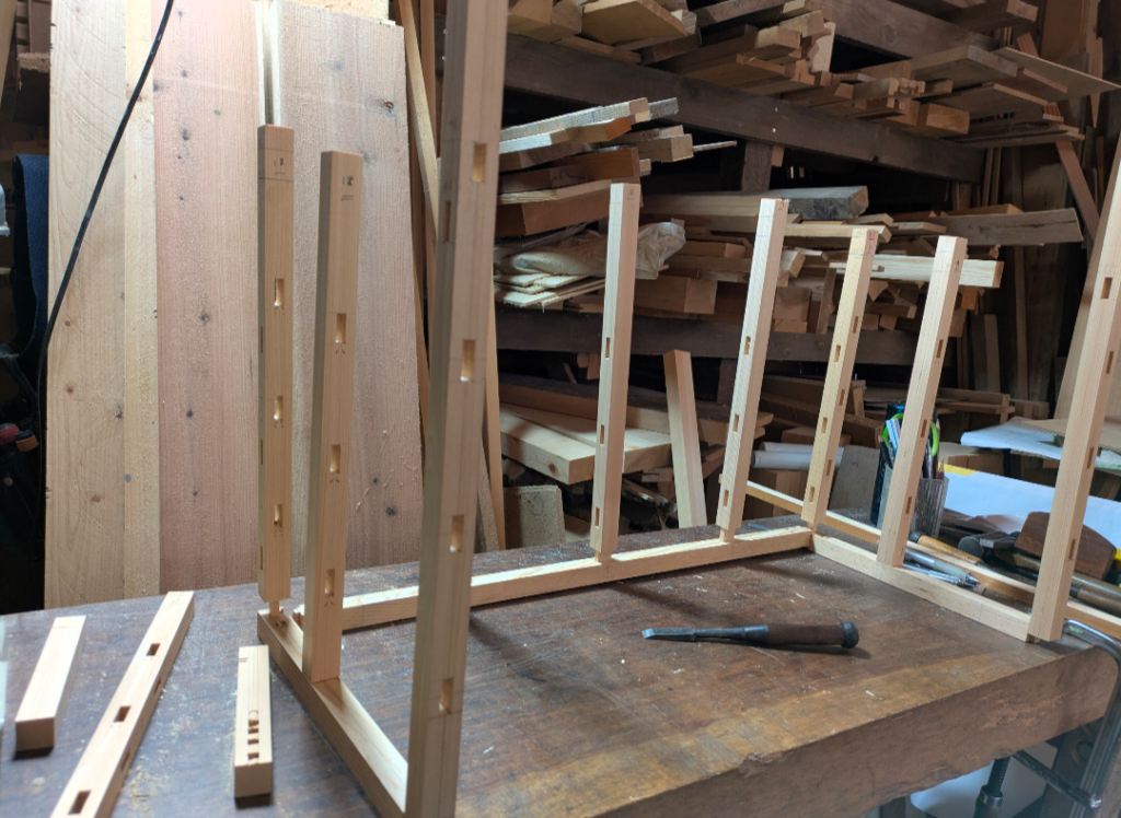 今日も1/5模型の製作を一段階進めました。 本日の主な作業は、土台と土台を繋ぐ「蟻(あり)加工」と柱と土台を繋ぐホゾ加工です。オスとメスのホゾをそれぞれ丁寧に刻み出し、仮組みを始めました。ピタリと噛み合う手応えは、手刻みならではの喜びです。金物を使わずに木と木を繋ぐ「蟻継ぎ」は、構造としての強さはもちろん、バラして再度組み上げることができる柔軟性も持っています。この土台がしっかり組み上がったことで、いよいよシミュレーションの基盤が整ってきました。目に見える形になっていく模型を前に、ここからさらに防音や断熱の質をどう高めていくか、構想が膨らみます。明日も一歩ずつ、本物の価値を形にするための精度を追い求めていきます。