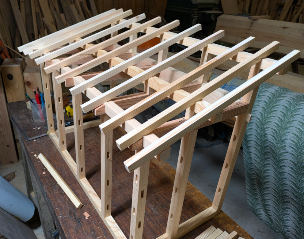 埼玉県鳩山町「喫茶幻」様の小屋建築。 1/5模型製作は、「屋根」の工程へと進みました。屋根材を支える11本の「垂木(たるき)」の加工と取り付けです。同じ角度、同じ寸法で一本ずつ丁寧に刻み棟、母屋、軒先へと流れるように並べていく。模型の内部に初めて「影」が落ち建物の表情はガラリと変わります。手が覚える、本番への手応え11本という数は、模型といえどなかなかの作業量です。しかし、この「繰り返し」が体が寸法を覚え、現場での迷いを少し消してくれると思っています。屋根が組み上がり全体のシルエットが見えてきました。 この骨組みを今度は大きな本物の木材で再現するために。、明日から製材作業に入ります。今日掴んだ感覚を大切に、次の一歩へ進みます。