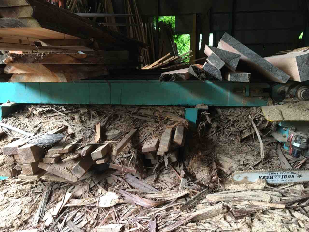 製材機の下を片付け無ければ修理が出来ず、チェーンが回らないのです。回らないと全て手作業なのです。